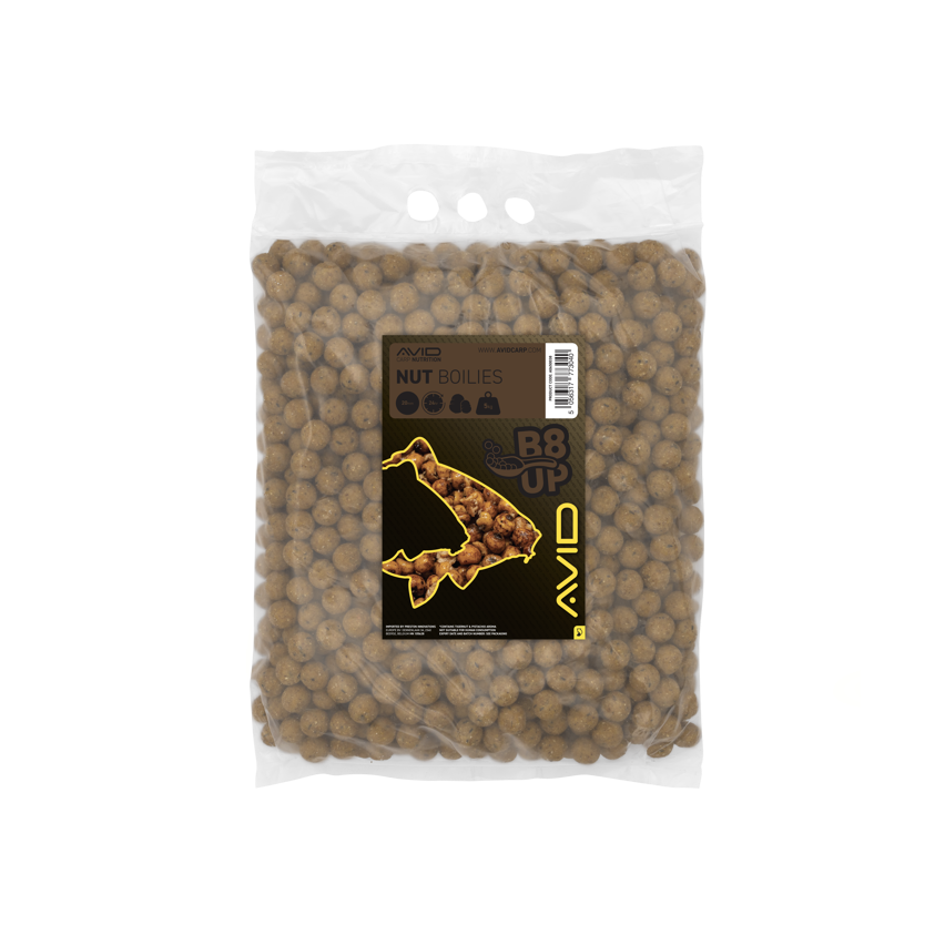 Boilies da marca Avid Carp, gama B8-Up, sabor Noz, especialmente para a pesca da carpa.