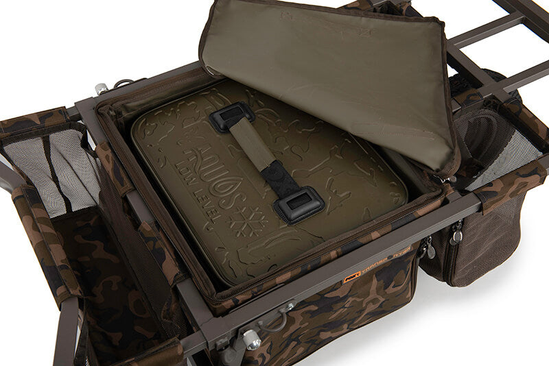Carrinho de transporte com a marca Fox, modelo Transportador,com design camuflado em Cor verdeespecial para a pesca com carpas.