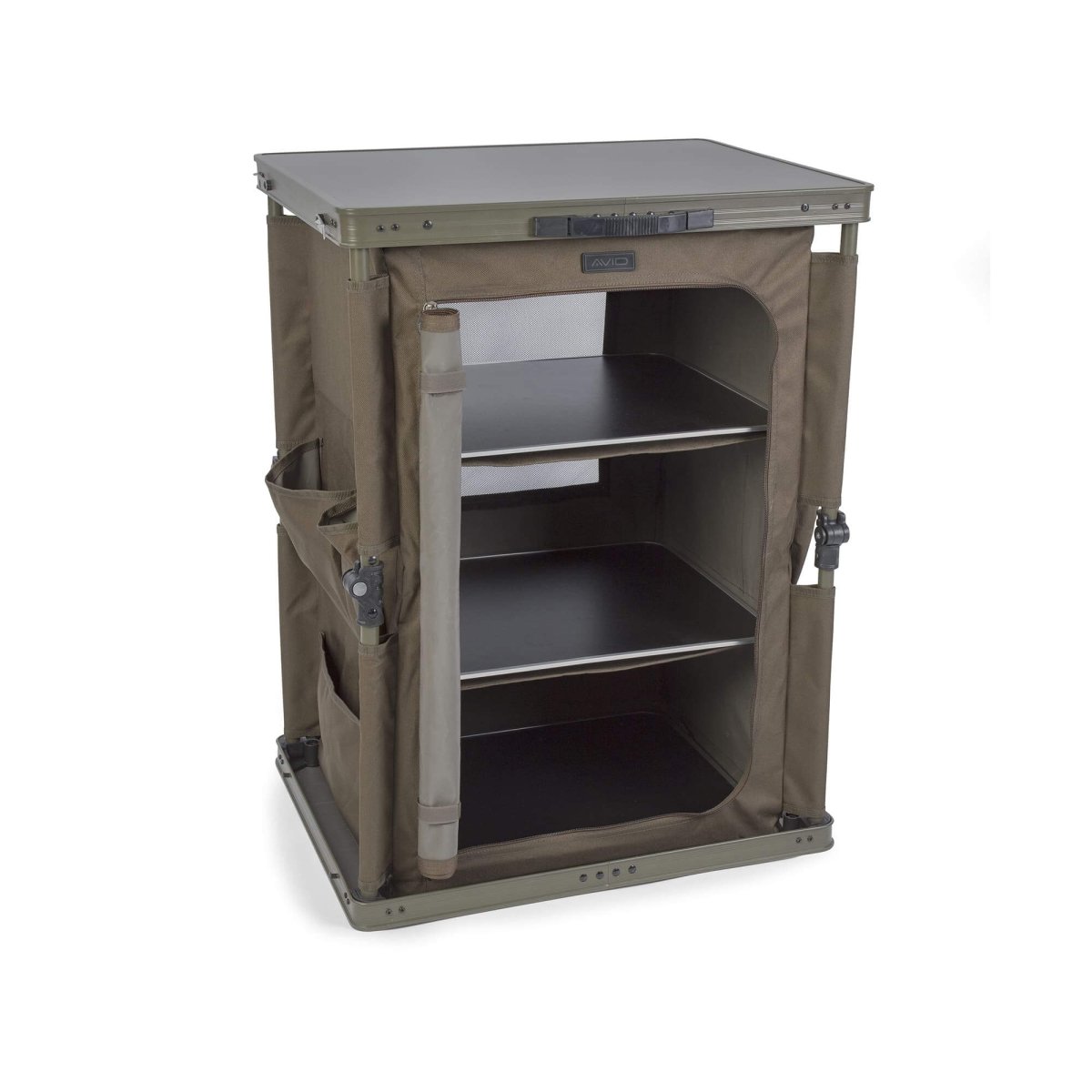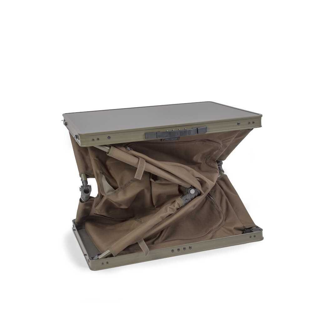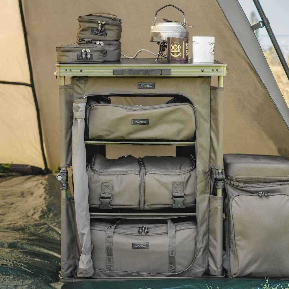 Mesa com armário organizador de marca Avid Carp, modelo Rápido Session, em Cor camuflado, especialmente para as suas sessões de pesca com carpas.