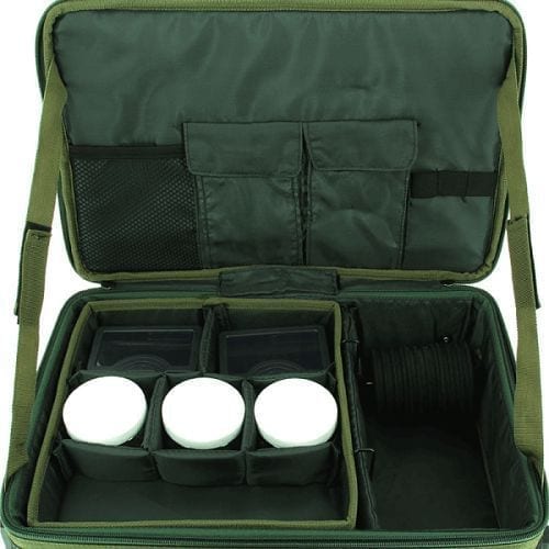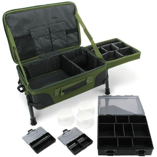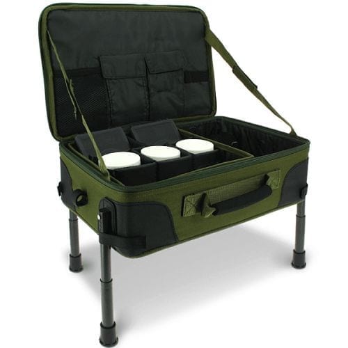 Estação de montagem com várias secções de fixação com velcro. Tem um tabuleiro lateral amovível e pernas ajustáveis. O seu material torna-a resistente à água.