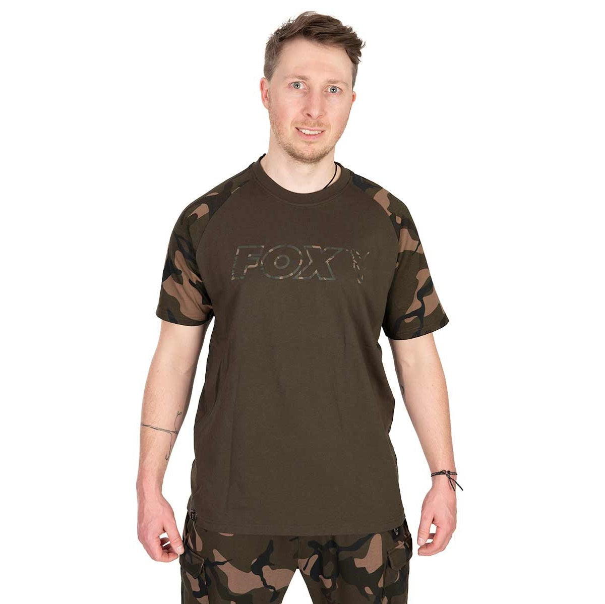 T-shirt com marca Fox modelo Outline T na cor caqui/camo, especialmente para a pesca com carpas.