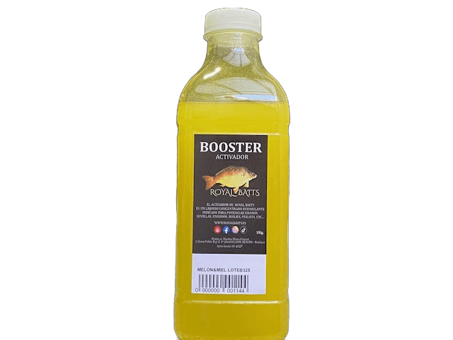 Booster com a marca Royal Baits, sabor Melão e Casca, perfeito para mergulhar boilies, pellets e misturas de spods para a pesca de carpas.