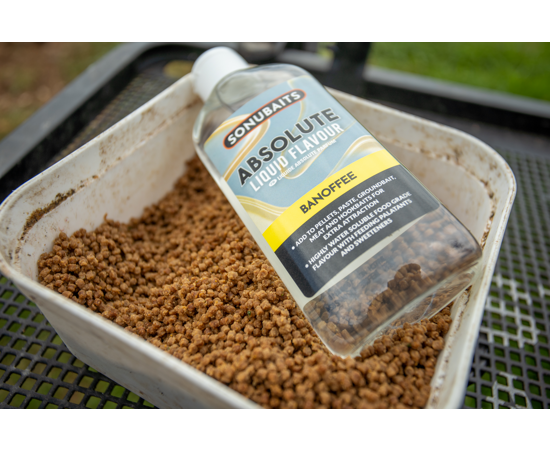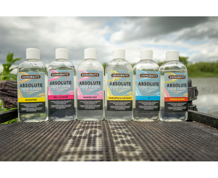 Líquido da marca Sonubaits, gama Absoluto, perfeita para reforçar os seus iscos de pesca com carpas.