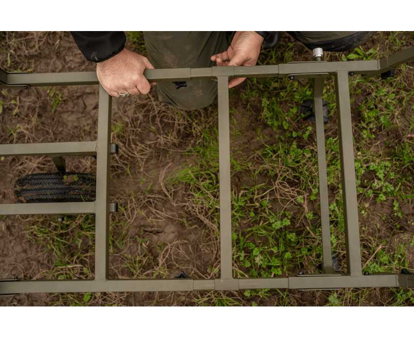 - Equipado com pneus robustos e pés grandes tipo lama Korum para estabilidade em terrenos irregulares