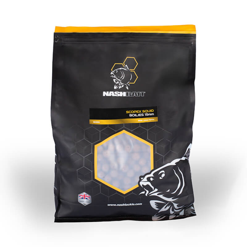 Saco de 1 quilo de boilies da marca Nash sabor Scopex Squid em Cor natural de 12 milímetros, especialmente para a pesca com carpas.