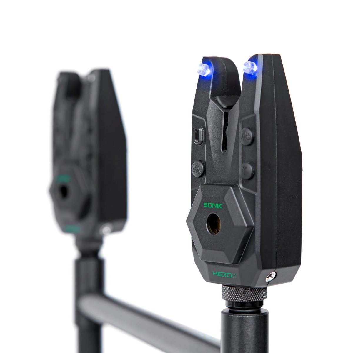 Definição do alarme 3+1 da marca Sonik modelo Herox. O conjunto é composto por 3 alarmes em Cor azul, verde y vermelho, e a quadro elétricoespecial para a pesca com carpas.