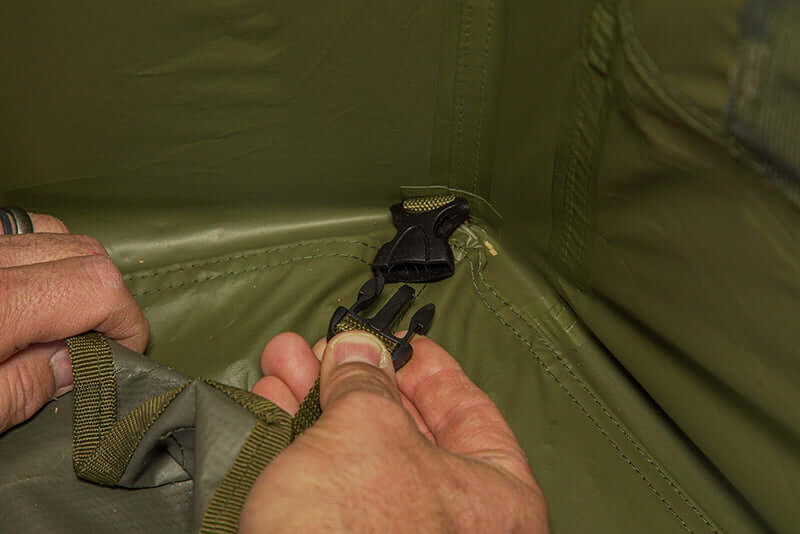 - Possui uma correia tensora em tecido, ilhós de cordão de tempestade com cordões guardados no saco de pinos