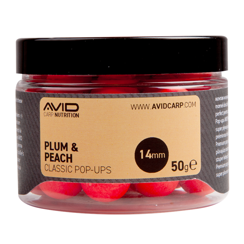 Pop Ups Bóias de marca Avid Carp, gama Classic, sabor Ameixa e Peachespecial para a pesca da carpa.