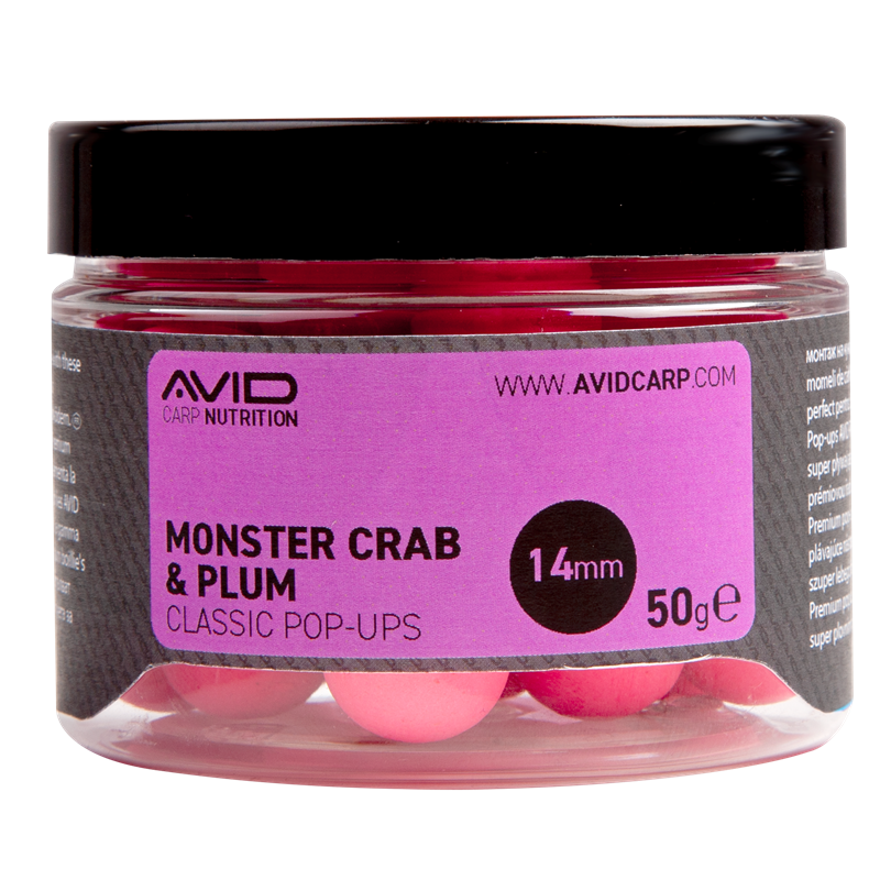 Pop Ups Bóias de marca Avid Carp, gama Classic, sabor Monster Crab & Ameixa, especialmente para a pesca da carpa.