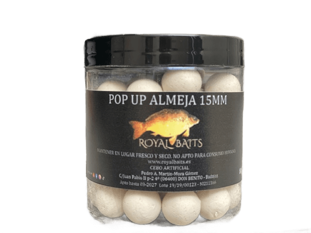 Pop Up flutuante da marca Royal Baits de 15 milímetros sabor Amêijoa em Cor branco, especialmente para a pesca de carpas.