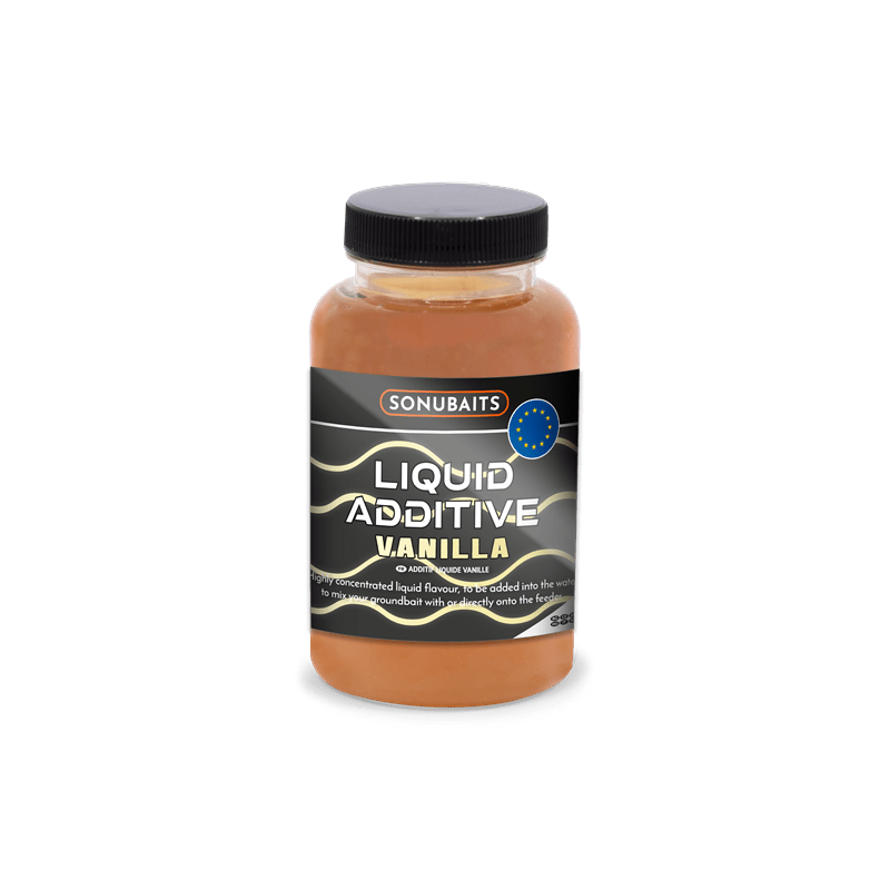 Aditivo líquido de marca Sonubaits, sabor Baunilha, especial para utilizar com os seus iscos de pesca com carpas.