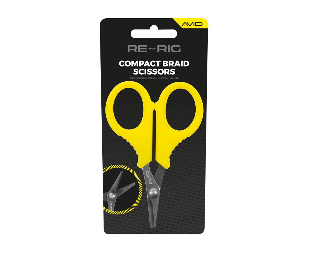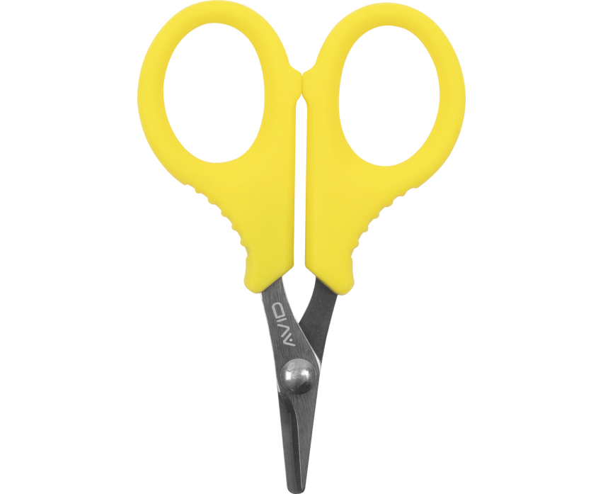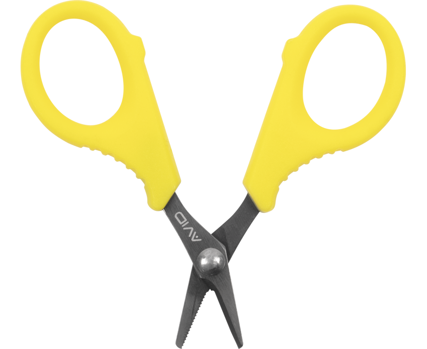 Tesouras da marca Avid Carp de Cor tamanho compacto amarelo para entrançar, especialmente para a pesca com carpas.