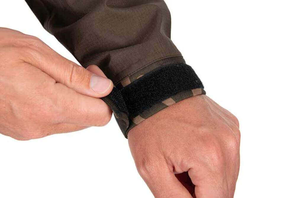Casaco impermeável com capuz da marca Fox modelo RS 10 K com desenho camuflado na cor caquiespecial para a pesca com carpas.