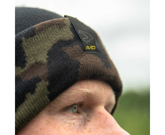Tampa Gorro com a marca Avid Carp, em Cor preto e camuflado, especialmente para a pesca com carpas.