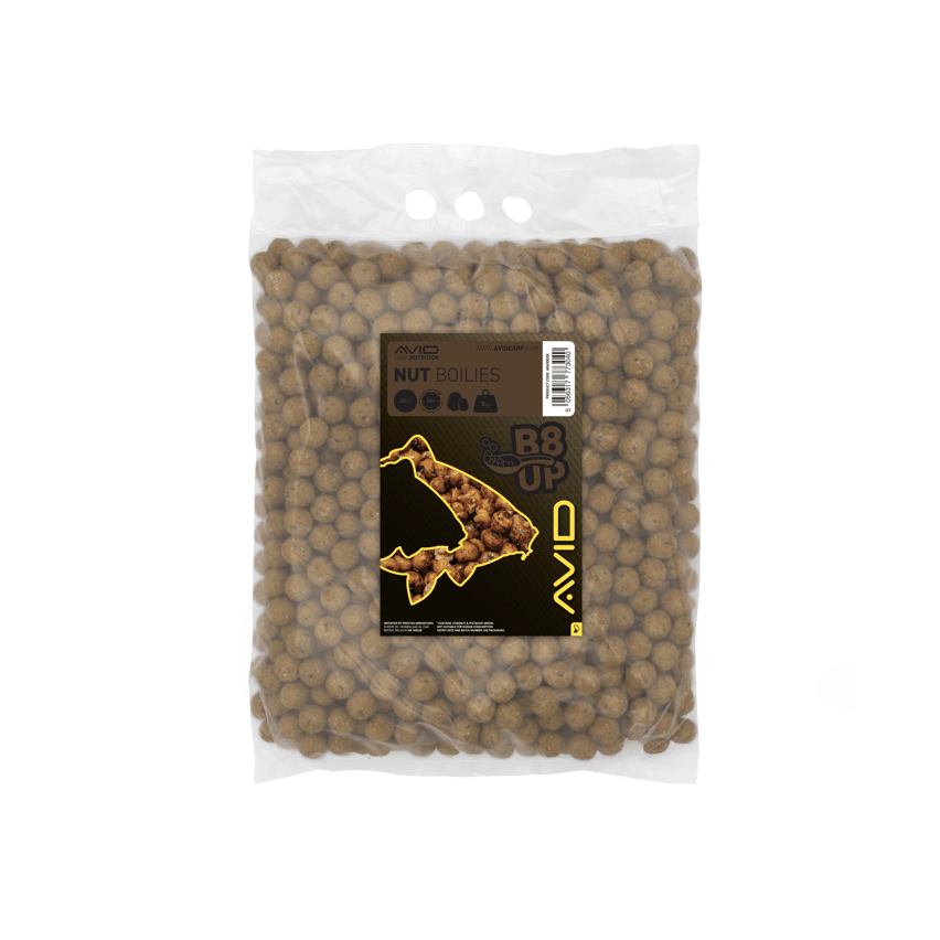 Boilies da marca Avid Carp, gama B8-Up, sabor Noz, especialmente para a pesca da carpa.