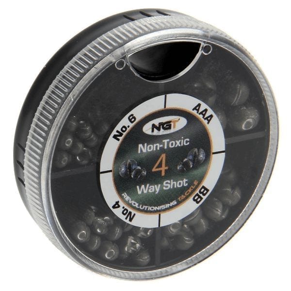 Caixa de chumbo com 4 compartimentos com chumbos de diferentes tamanhos para equilibrar as suas posições flutuantes.