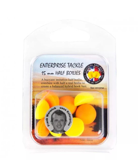 Meios Boilies marca artificial Enterprise de 15 mm em cor de laranja e amarelo, especial para a pesca da carpa.