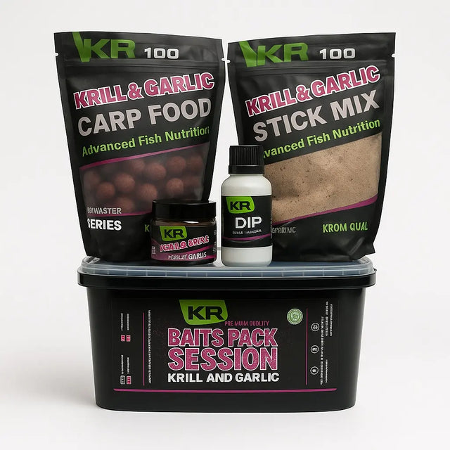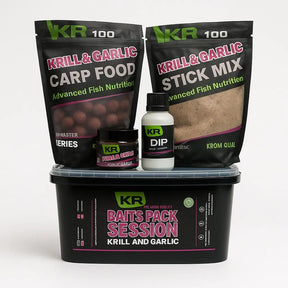 Muitas iscas Krom Quality alcance KR100 sabor Krill e Garlic, especialmente para a pesca da carpa.